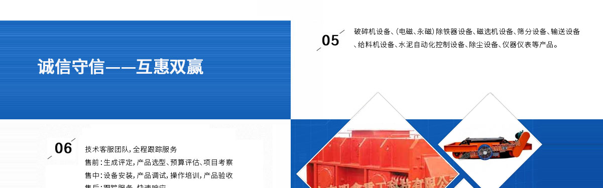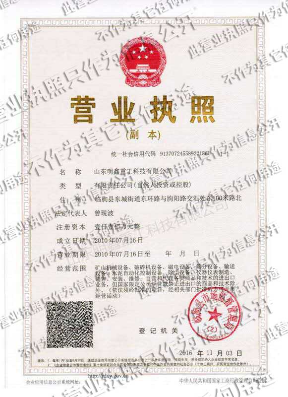 山東明鑫重工科技有限公司為是集科研開(kāi)發(fā),設(shè)計(jì)制造、銷(xiāo)售、安裝、調(diào)試為一體的技術(shù)制造企業(yè)。公司位于美麗的****風(fēng)箏都-濰坊市(國(guó)家AAAA級(jí)森林公園-沂山景區(qū)駐地)臨朐東城工業(yè)園。本公司產(chǎn)品種類(lèi)有:破碎機(jī)設(shè)備,(電磁、永磁)除鐵器設(shè)備,磁選機(jī)設(shè)備,篩分設(shè)備,輸送設(shè)備,給料機(jī)設(shè)備,水泥自動(dòng)化控制設(shè)備、除塵設(shè)備,儀器儀表等產(chǎn)品。其產(chǎn)品有五十多個(gè)系列,四百多種規(guī)格,并可根據(jù)客戶需求設(shè)計(jì)生產(chǎn)相應(yīng)的產(chǎn)品。其產(chǎn)品廣泛應(yīng)用于冶金、電力、煤炭、礦山、造紙、食品、化工建材、耐火材料、磚瓦、水泥、玻璃等行業(yè),產(chǎn)品暢銷(xiāo)國(guó)內(nèi)三十多個(gè)省市、自治區(qū)。